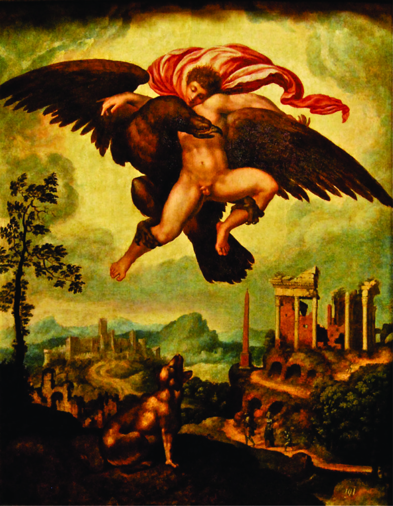O poderoso Senhor dos deuses se transformou em uma enorme águia, arrebatou o jovem e, dominado pela paixão, o possuiu ainda em pleno voo. Ganímedes foi levado ao Olimpo e Zeus encarregou o jovem de substituir Hebe na função de servir o néctar e a ambrosia aos deuses.