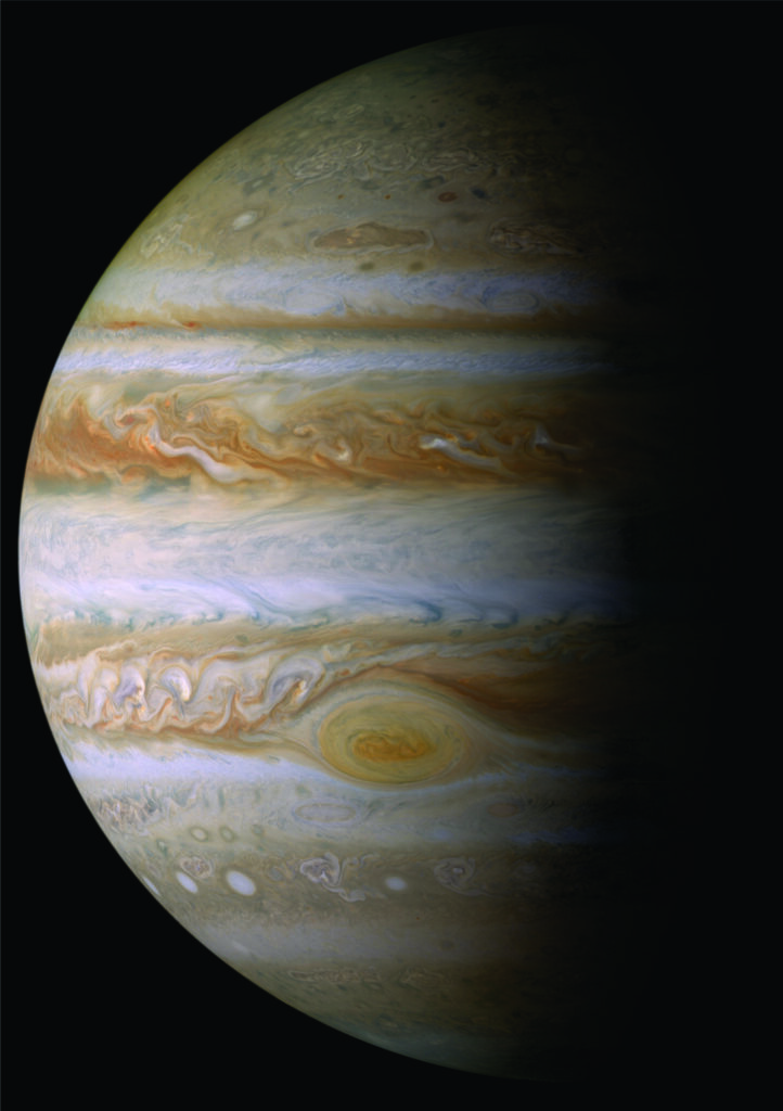 As nuvens de Júpiter possuem cores de tom laranja e marrom, devido a compostos que mudam de cor quando expostos aos raios ultravioleta do Sol. Abaixo da atmosfera, Júpiter é fluido, mas ao contrário da maioria dos fluidos, o planeta gira como se fosse uma massa sólida.