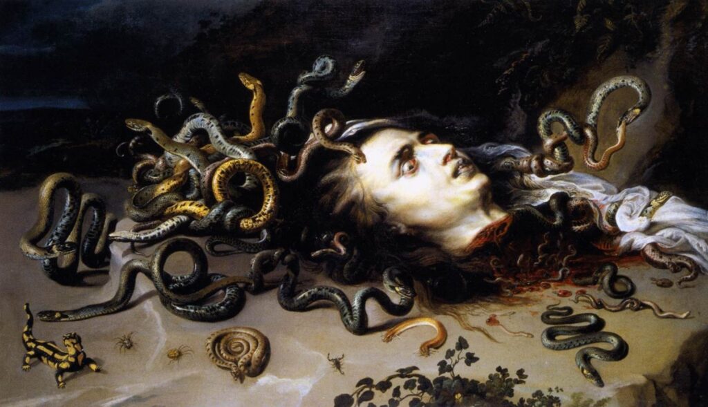 A Medusa, uma das três Górgonas, havia sido violentada por Poseidon o que a deixou com um semblante assustador devido ao horror e ultraje que sentiu. Seu rosto é a expressão do ódio feminino, possuía um olhar gélido, serpentes no lugar dos cabelos e qualquer um que a contemplasse ficava petrificado.