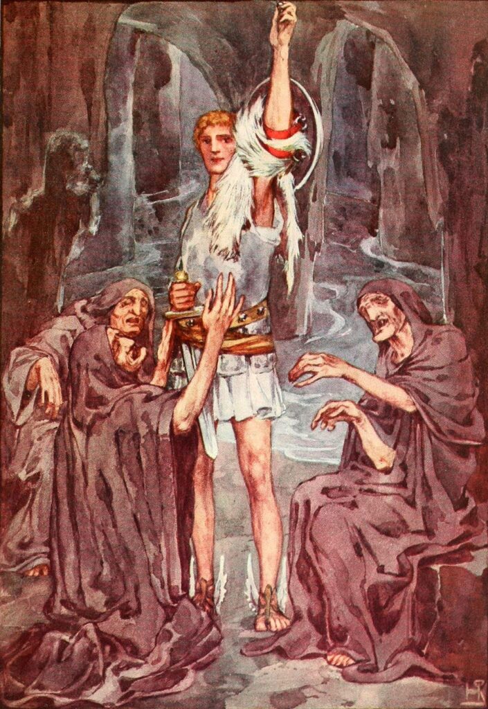 Hermes, o senhor dos caminhos, o ajudou nesta trajetória. Ao chegar até elas, Perseu, em um gesto rápido, se apoderou do único olho que elas possuíam, prometendo devolvê-lo somente se elas lhe dessem a informação desejada.