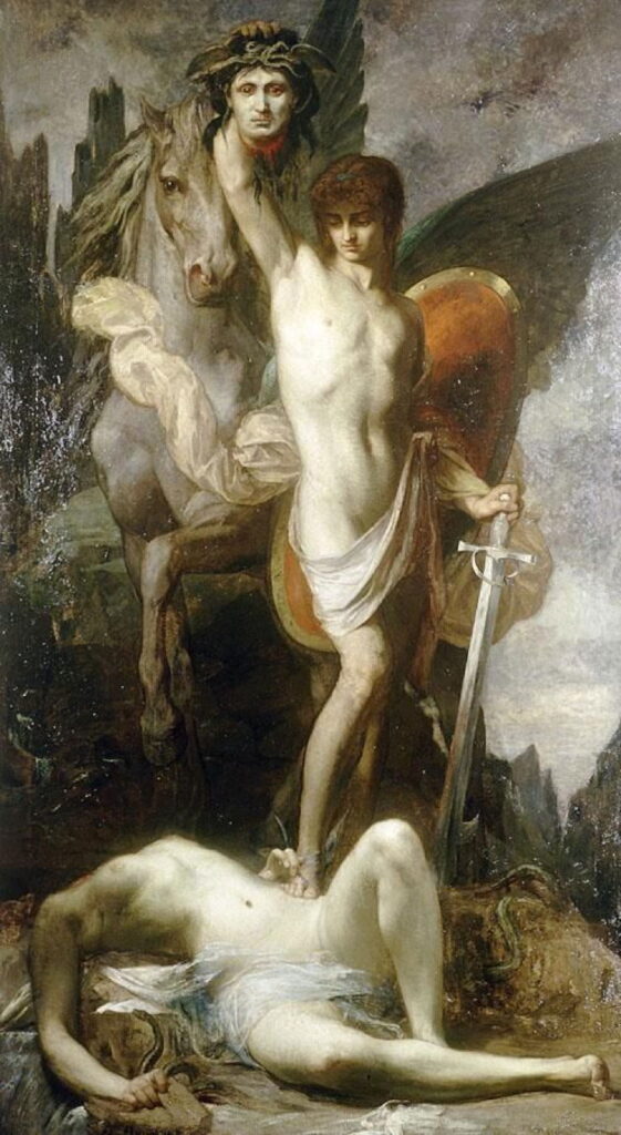 Do corpo decapitado nascem Pégaso, o cavalo alado e o gigante Crisaor, ambos filhos de Poseidon, mas que ela não conseguia dar à luz por causa do horror do estupro.